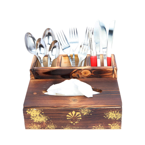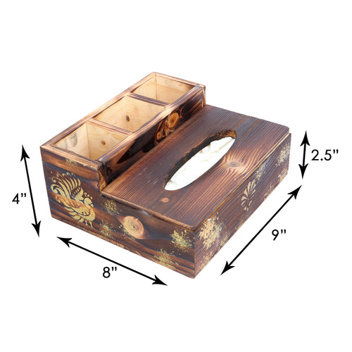 Rustic wood textured multipurpose tissue holder with gold motif is a handmade wood product exclusively crafted of high quality wood. It consists of unique gold motif carving.  This is an exclusively handcrafted product made of high quality wood textured by skilled craftsmen for ethenic antique look and painted with gold motif giving luxury and elegance look. This tableware is handmade wood product exclusively crafted from premium quality wood. This product is 100% made in India and handmade by skilled artisans. The tissue holder is decorative and is ideal to be used at variety of places including your tabletops and your dinner tables.Â