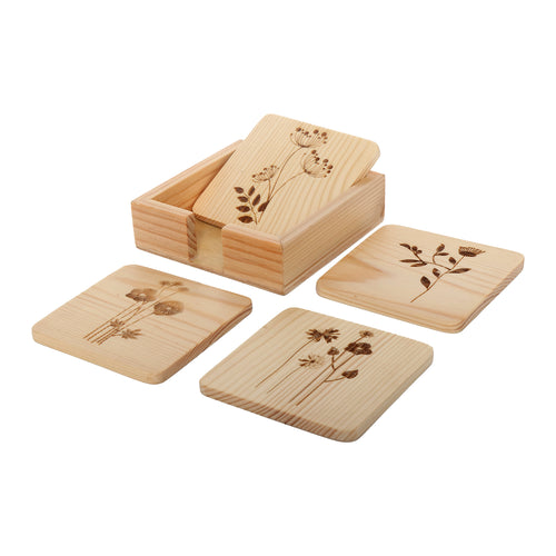 Wood coaster flower motif carving set of 4 with stand is a handmade wood product exclusively crafted of high quality wood. It consists of a unique flower motif carving. This tableware is a handmade wood product exclusively crafted from premium quality wood. This product is 100% made in India and handmade by skilled artisans. The coaster set is decorative and is ideal to be used at a variety of places including your tabletops and your dinner tables.Â