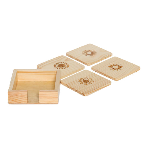 Wood coaster sun motif carving set of 4 with stand is a handmade wood product exclusively crafted of high quality wood. It consists of a unique sun motif carving. This tableware is handmade wood product exclusively crafted from premium quality wood. This product is 100% made in India and handmade by skilled artisans. The coaster set is decorative and is ideal to be used at a variety of places including your tabletops and your dinner tables.Â