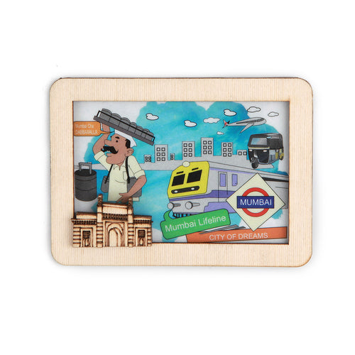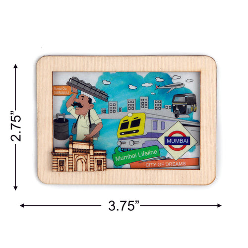 Wood laser cut print laminated fridge magnet dabbawala has unique hand drawn design laser cut veneer wood iconic gateway of India, colourful laminated print representing the vibrant colourful city of Mumbai with iconic landmarks, dabbawala, dream city of various transport modes A beautiful memento representing Mumbai exclusively designed and crafted having rubberised sheet magnet. It has front clear acrylic and is backed with a rubberised magnet. Wood veneer photo frame fridge magnet is an exclusive décor and collectibles gift item for various occasions like birthday, anniversary, housewarming, weddings. Add a lot of beauty to the house with this wonderful masterpiece. Please note print colour may vary subject to availability in stock.