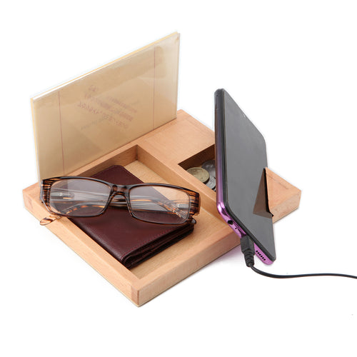 Wood mobile docking tray with photo frame is a handmade wood product exclusively crafted of high quality wood. This is a handmade wooden mobile docking station tray made from high quality wood exclusively designed, crafted along with a photo frame giving a stunning look. This tray will not only keep accessories in one place, it will have a wisely organized space. This tableware is a handmade wood product exclusively crafted from premium quality wood. This product is 100% made in India and handmade by skilled artisans. This tray gives a rich and exquisite feel to your office, kitchen & home.